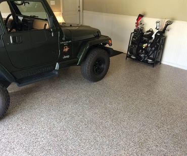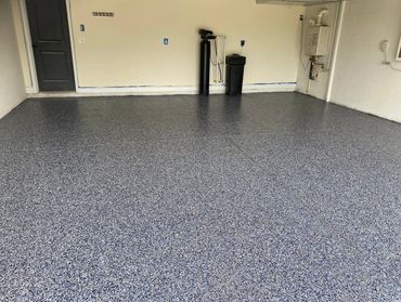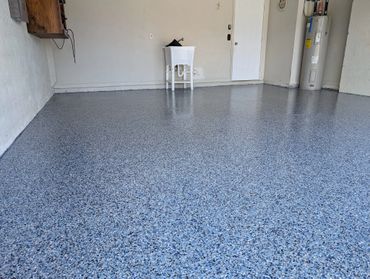 While the epoxy is still wet, vinyl Flake is broadcast across the floor until the epoxy cannot hold any more. This creates a uniform appearance from the selected color combination.