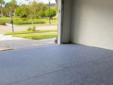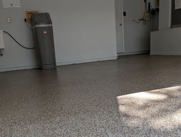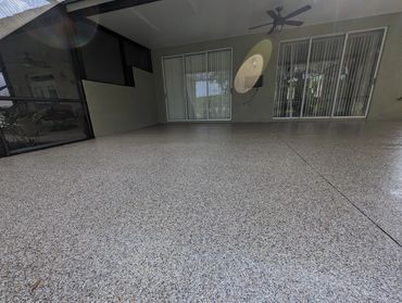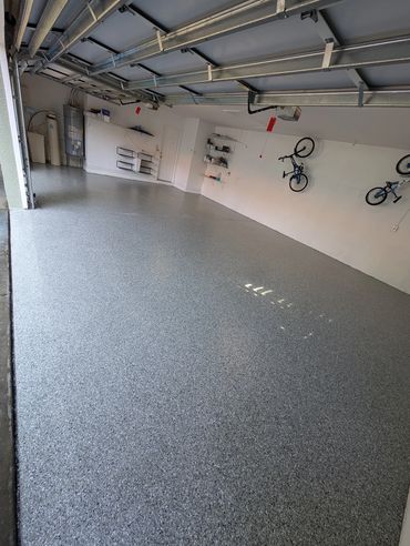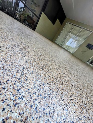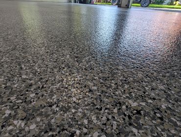 Once the excess flakes are removed and the floor is scraped flat, a UV-stable, clear protective polyaspartic coating is applied to the surface, providing the floor with superior durability and protection.